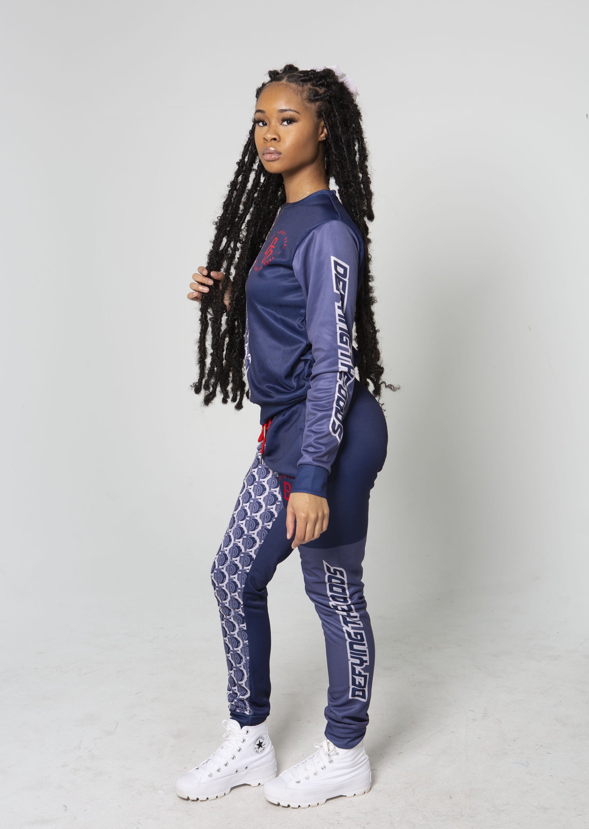 Split pattern with textile print on one side and Defying the Odds on the sleeve and leg